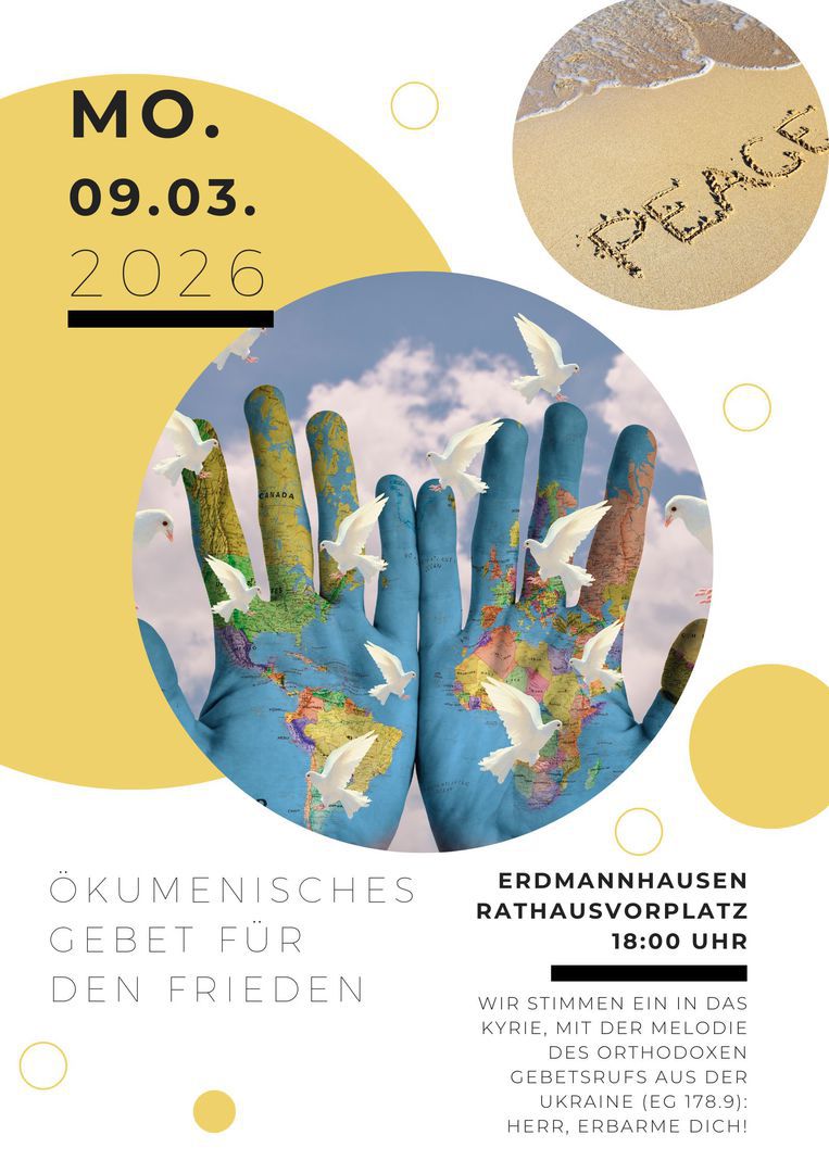 Gerne möchten wir als Ökumene weiterhin einmal im Monat zum Gebet für den Frieden weltweit einladen, und zwar in der Regel am zweiten Montag des Monats. Der nächste Termin ist am Montag, 09.02.26, um 18.00 Uhr auf dem Rathausvorplatz in Erdmannhausen. Weitere Termine sind am 09.03.26, 13.04.26 und 11.05.26. Alle sind eingeladen und herzlich willkommen!