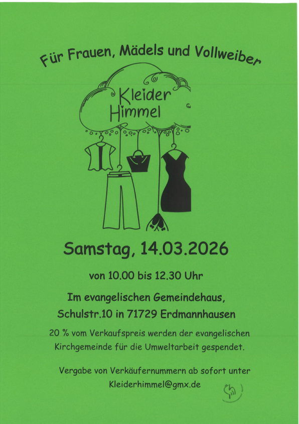 Zum fünften Mal findet am Samstag, den 14.03.2026, von 10.00 bis 12.30 Uhr der Frauenkleidermarkt „Kleiderhimmel“ im evangelischen Gemeindehaus in der Schulstr. 10a, Erdmannhausen statt.