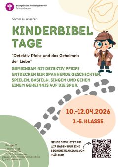 Ihr seid alle (Kinder von der 1. bis 5. Klasse) herzlich eingeladen zu den Kinderbibeltagen vom 9. - 12. April 2026 in Erdmannhausen.